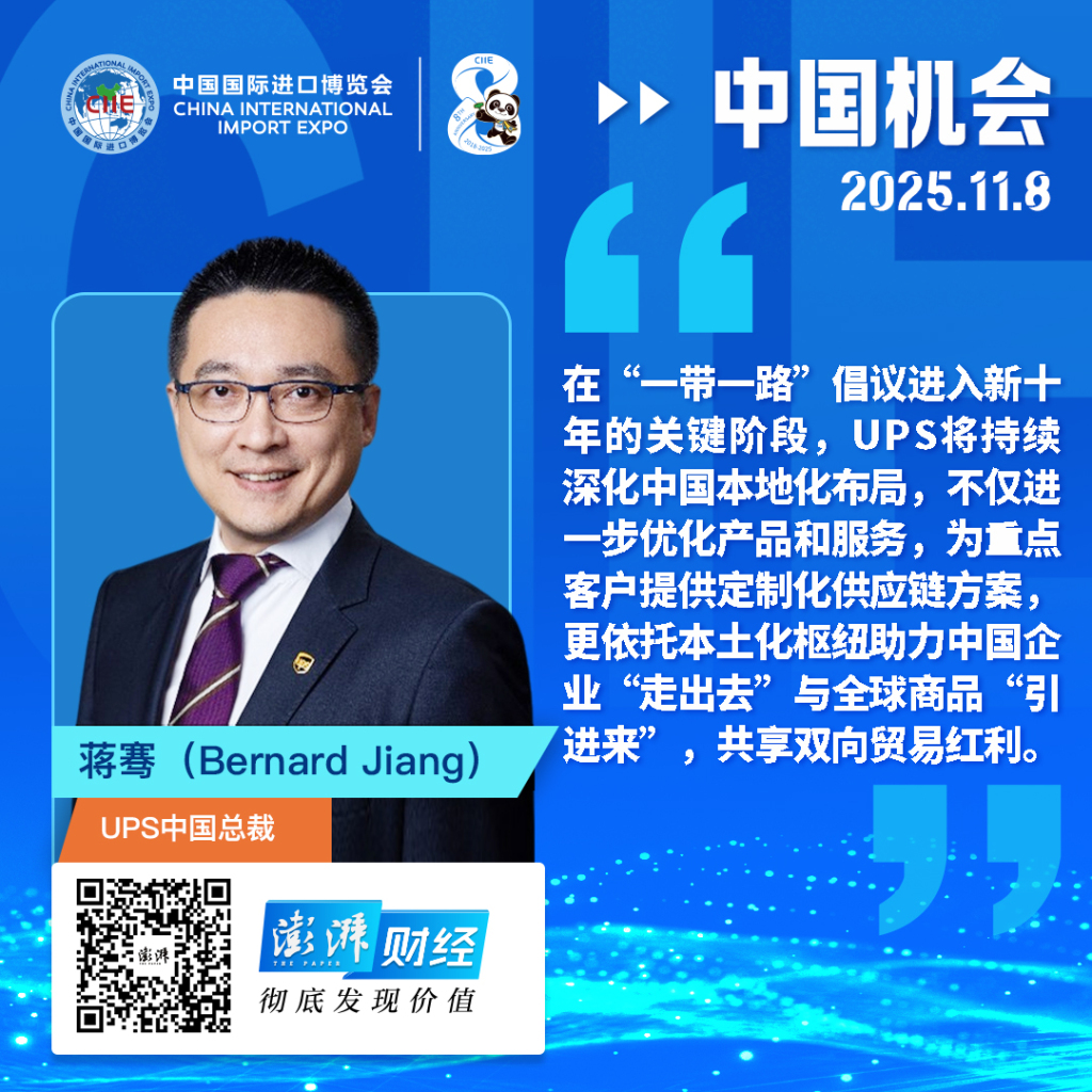 “在2025年充满挑战与机遇的全球贸易环境下,进博会已成为观察全球贸易趋势的重要窗口,也是UPS与中国市场深度对话的战略平台。在‘一带一路’倡议进入新十年的关键阶段,UPS将持续深化中国本地化布局,不仅进一步优化产品和服务,为重点客户提供定制化供应链方案,更依托本土化枢纽助力中国企业‘走出去’与全球商品‘引进来’,共享双向贸易红利。”